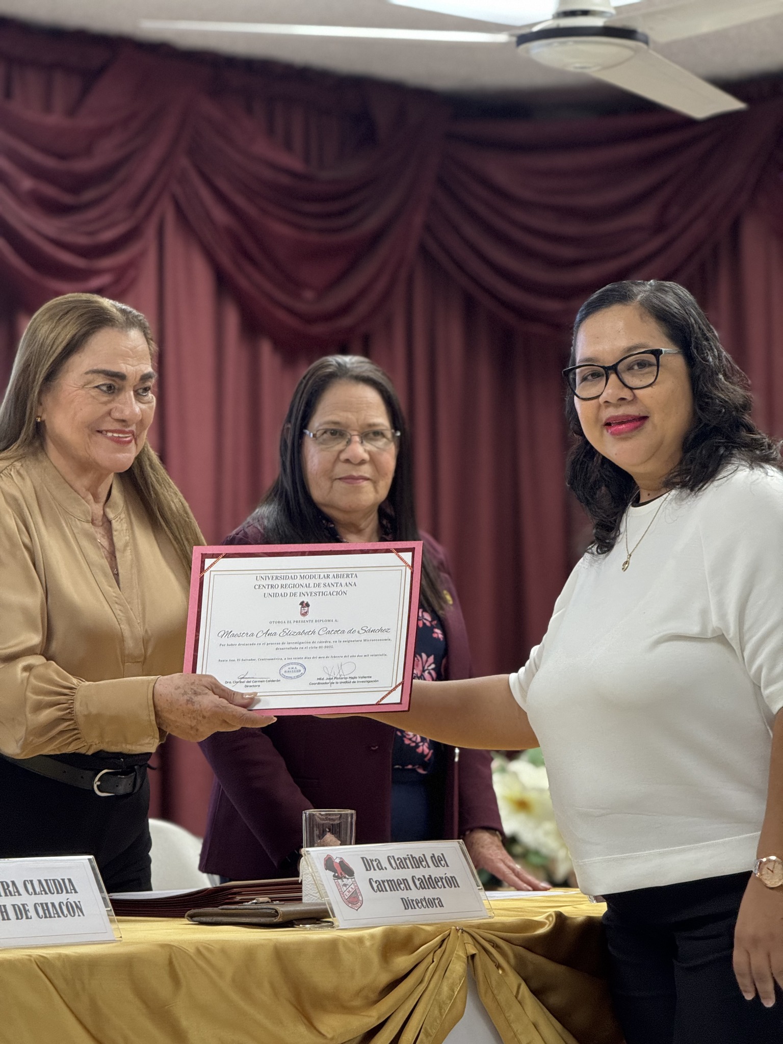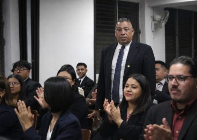 Durante su intervención, la Dra. Claribel del Carmen Calderón, Directora del Centro Regional de Santa Ana, subrayó que la calidad educativa requiere un trabajo integral y coordinado, señalando que no puede concebirse la docencia sin investigación ni compromiso social. Asimismo, reconoció el esfuerzo de docentes y estudiantes, destacando que los desafíos deben asumirse como oportunidades de crecimiento y que el trabajo en equipo fortalece cada proyecto académico.